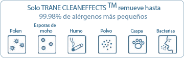Trane cuenta con un sistema llamado TRANE CleanEffets ™ que es el filtro de aire más efectivo pues elimina hasta el 99.98% de los irritantes que pueden producir asma y alergias, lo que proporciona un mejor calidad de aire: